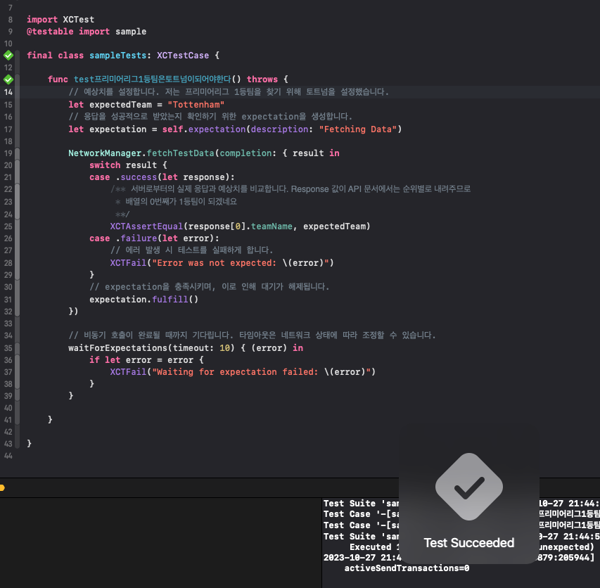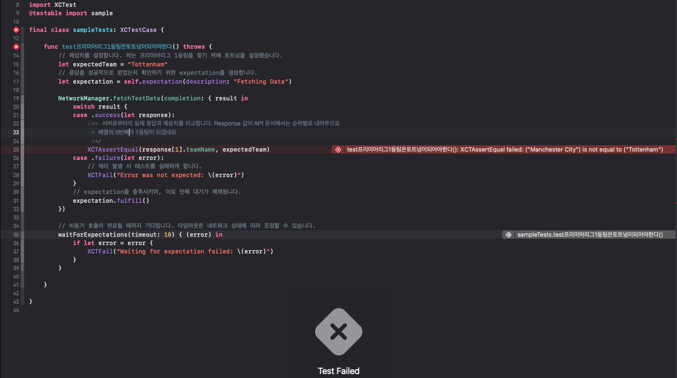 - 실제 테스트가 수행되는 부분입니다. 이 함수는 네트워크에서 데이터를 가져오는 비동기 호출을 테스트합니다. XCTestExpectation을 사용하여 비동기 작업을 기다리고, 결과가 성공인지 실패인지에 따라 테스트를 판단합니다.