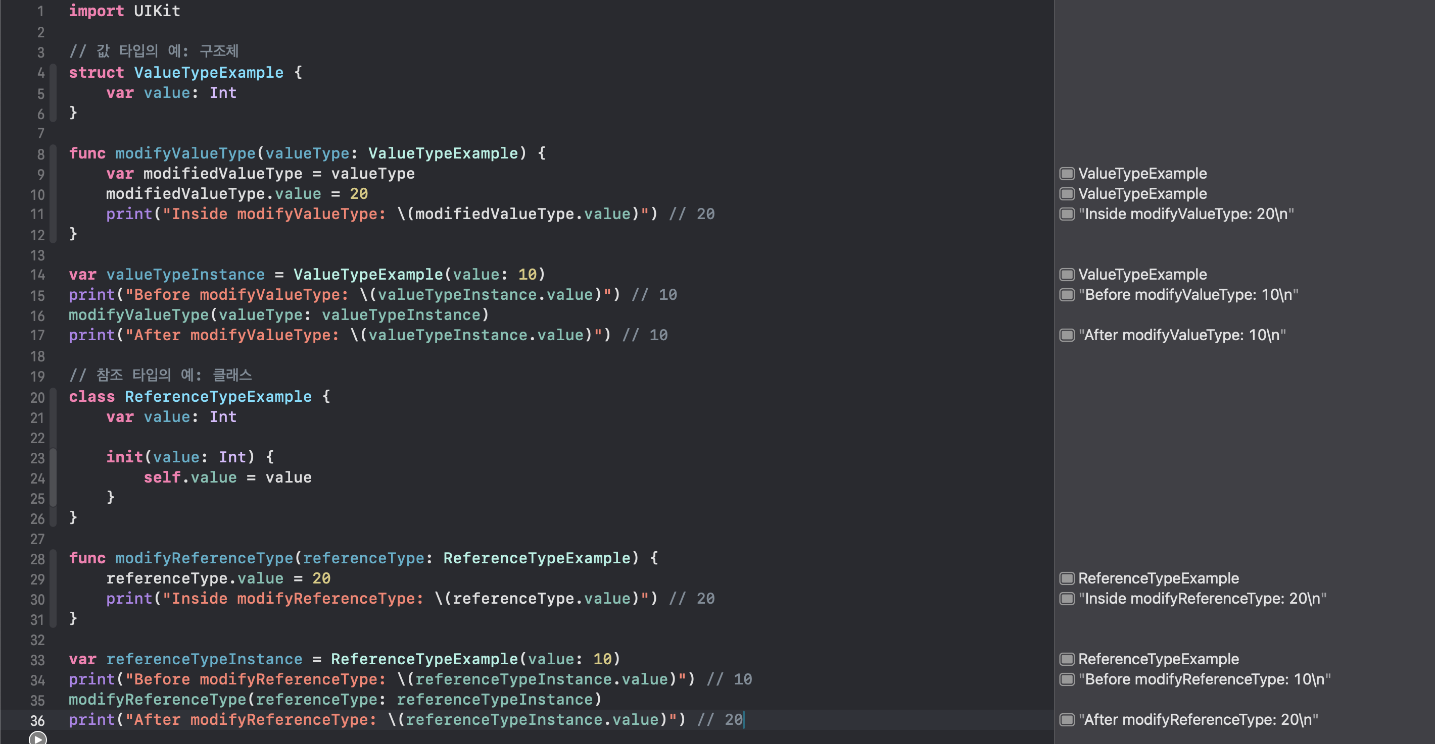 • 함수 modifyValueType에서 구조체의 값을 변경해도 원본 인스턴스는 변경되지 않습니다.