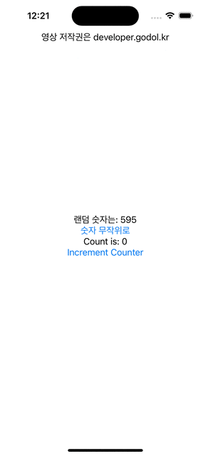 새로운 랜덤 숫자가 생성될 때 CounterView 내에서 @ObservedObject를 사용하면 @Published의 변수인 카운터가 초기화되는 것을 볼 수 있습니다.